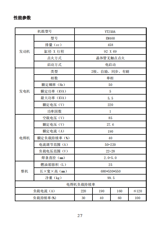 品牌:伊藤动力 型号:YT250A 焊接5.0以内焊条,发电机部分:5kw 交流:220v输出